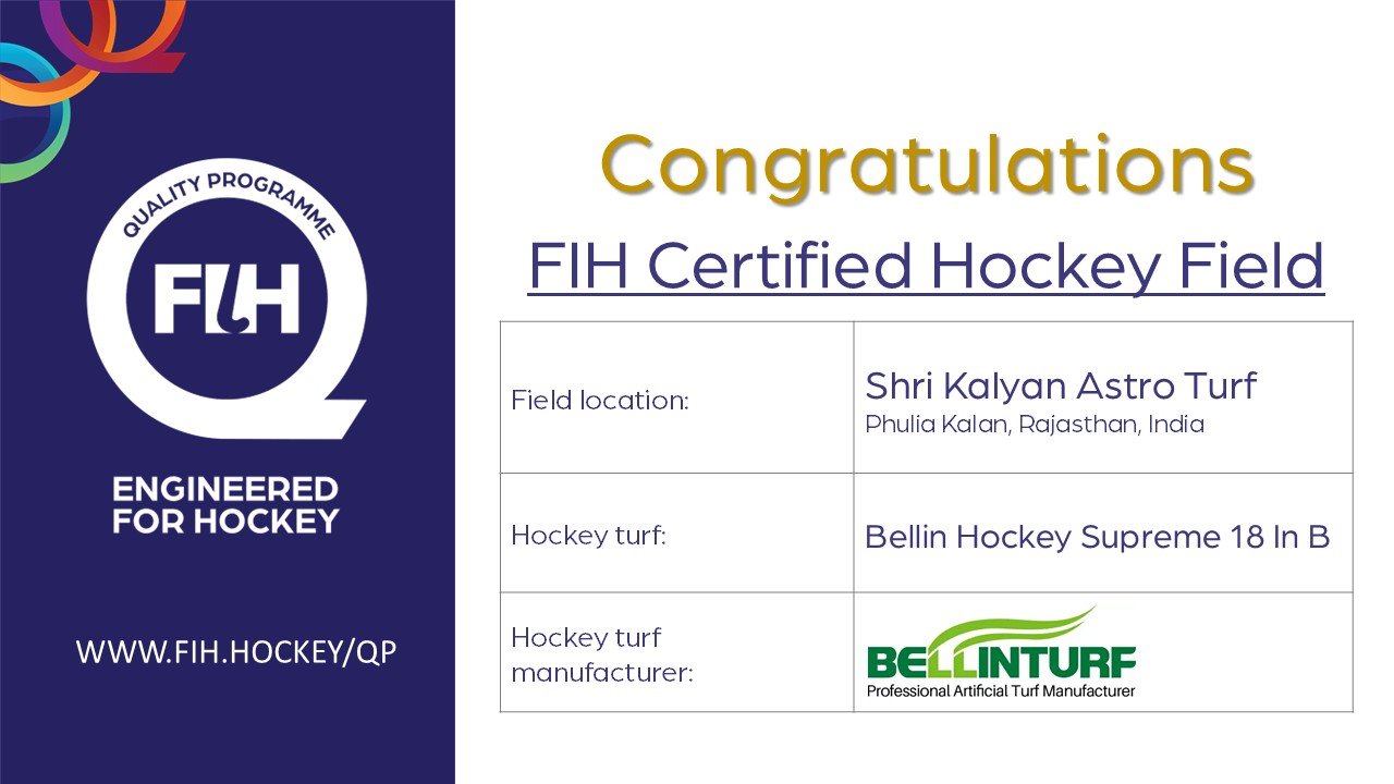 The Shri Kalyan Astro Turf in Phulia Kalan, Rajasthan, has officially achieved FIH Category 3 Certification. As a core facility of the Shri Kalyan Hockey Academy (CASE), this professional Bellin Hockey Supreme surface provides world-class infrastructure for government school students. Established by Shri Kalyan Seva Sansthan (SKSS), this FIH-certified field bridges the gap between rural talent and international standards.